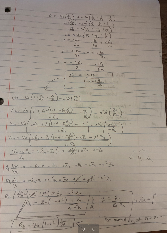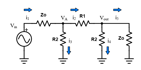 For \(R_1\) I had to perform an additional substitution. Since we are solving for a perfectly matched attenuator, we want the input impedance equal to \(Z_o\), so we set \(V_A = \frac{1}{2}V_{in}\). Then using this substitution in Equation 4 we get: \[