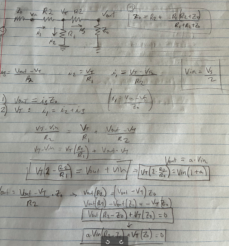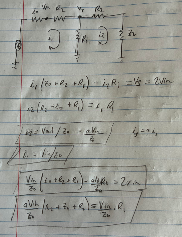 import sympy as sp# Define symbolsr1, r2, v_in, a, z_o, i1, i2 = sp.symbols('r1 r2 v_in a z_o i1 i2')# Equationseq1 = sp.Eq(v_in/z_o*(z_o+r2+r1)-a*v_in*r1/z_o, 2*v_in)eq2 = sp.Eq(a*v_in/z_o*(r2+z_o+r1), v_in/z_o*r1)# Solve system for r1 and r2 solutions = sp.solve([eq1, eq2], [r1, r2], dict=True)atten_sol = sp.solve([eq2],[a], dict=True )print('-----------------------------')print('Outputs:')print(solutions)print(atten_sol)print('-----------------------------')