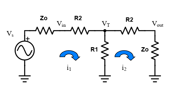 I defaulted to trying to solve this with nodal analysis because that is my preference even though the circuit is obviously conducive to mesh analysis. What I found when trying to solve with nodal analysis is that you end up with \(V_T\) as an unknown without a way to get rid of it. Looking back at solving the Pi-Pad, you can see that the two unknown voltage nodes can be solved simply by defining the circuit assumptions. For example, the input voltage node is 1/2 of the source voltage, and the output voltage node is determined by the attenuation factor. Due to this simplificaiton, we were able to solve for \(R_1\) and \(R_2\) directly because we never had any unknown voltage variables to deal with.